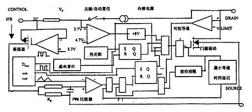 漏极端(DRAIN脚)与输出MOSFET漏极连接。启动时,提供内部偏置电流,控制端(CONTROL脚)控制输出占空比,是误差放大器和反馈电流的输入端。正常工作时,由内部并联稳压器提供内部偏置电流,也可以作电流旁路和自动启动/补偿电路电容的接点,源极端(SOURCE脚)和输出MOSFET的源极连接,也是开关电源初级电路的公共点和参考点。
